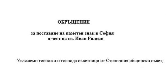 Инициативен комитет излезе с обръщение към Столичния общински съвет, за поставяне на паметен знак в София в чест на св. Иван Рилски. Обръщението е подписано от университетски преподаватели, историци, журналисти и др. Следва неговият текст.