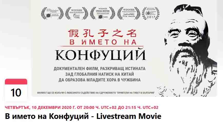 На 10 декември, четвъртък, от 20 ч. българско време, ще се състои онлайн прожекция на документалния филм „В ИМЕТО НА КОНФУЦИЙ“, на страницата „Китай без цензура„. Филмът ще се излъчи със съдействието на сдружението “Приятели на Тибет в България“.