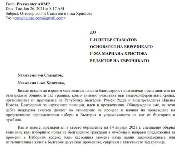 Вчера, 26.01.2021 г., получихме отговора на Президентството, който може да изтеглите от ТУК. По-долу Ви представяме факсимиле от началото на писмото, а след него, за удобство на читателите ни, сме поставили конкретните въпроси и получените отговори.