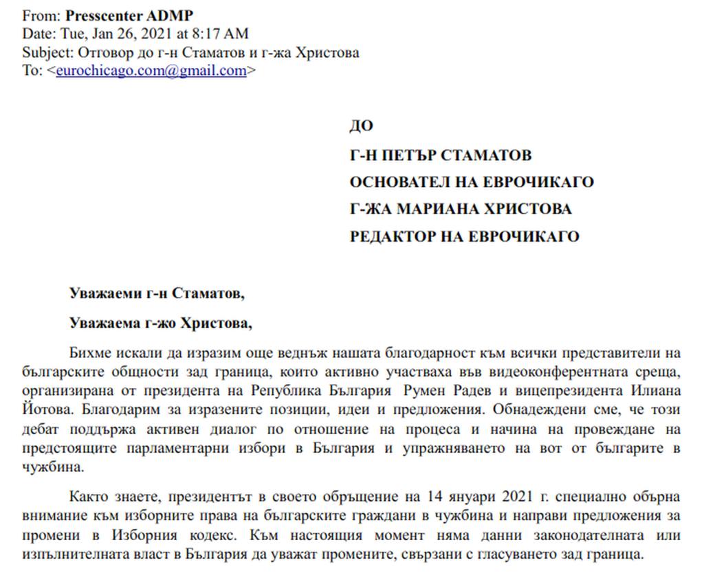 В увода четем: „Както знаете, президентът в своето обръщение на 14 януари 2021 г. специално обърна внимание към изборните права на българските граждани в чужбина и направи предложения за промени в Изборния кодекс. Към настоящия момент няма данни законодателната или изпълнителната власт в България да уважат промените, свързани с гласуването зад граница.“