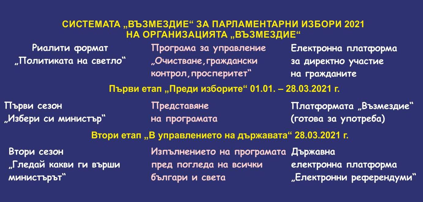 „ВЪЗМЕЗДИЕ“ е организация, която осигурява възможност на българските граждани да участват директно в Народното събрание, Правителството, местната и съдебна (при избора на членове на Висшия съдебен съвет) власт, чрез едноимената електронна платформа („ПЛАТФОРМАТА“) от своя 🖥 компютър, 💻 лаптоп или📱телефон, за да защитят родината, правата и интересите си. „ВЪЗМЕЗДИЕ“ ще участва на предстоящите парламентарни избори.
