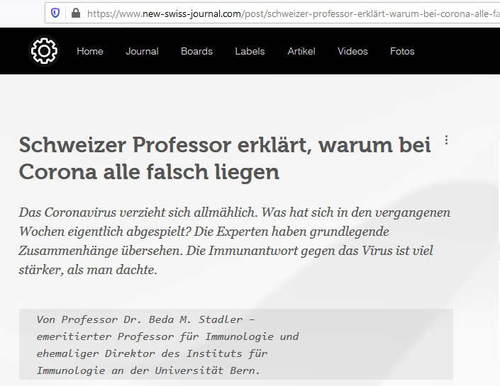 „Швейцарски професор обяснява защо всички грешат за коронавируса“ („Schweizer Professor erklärt, warum bei Corona alle falsch liegen“) – съвременна статия, публикувана в New Swiss Journal.