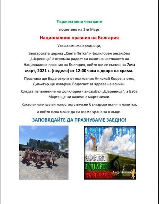 Българската православна църква „Света Петка“ и фолклорен състав „Шареница“ в Сейнт Питърсбърг, Флорида, организират на 7 март т.г., неделя, от 12.00 часа местно време, честване на Националния празник на България 3 март. Честването ще се състои в двора на храма.