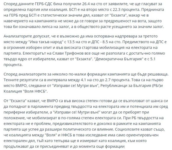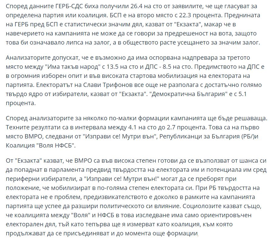 Извадката включва 123 гнезда в 90 населени места на територията на България. Като към 22 февруари категорично решилите да гласуват са 45 на сто, но „Екзакта“ очаква активността по-скоро да намалява до датата на вота. Поне такава е тенденцията през последните месеци, казват анализаторите.