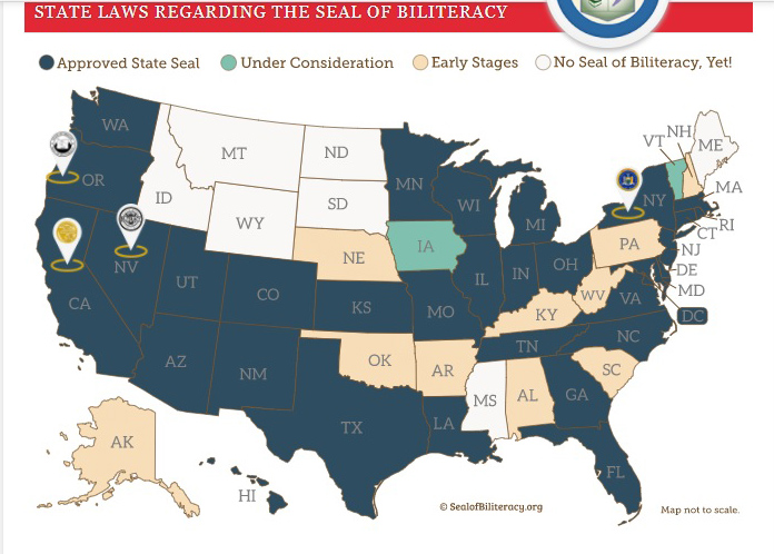 Федерален окръг Колумбия включва българския език в програмата Seal of Biliteracy през пролетта на 2018 г. (вж. тук). В резултат на действията на българския посланик във Вашингтон Тихомир Стойчев, на втория секретар в посолството Даниела Сиракова, на други български дипломати в САЩ, българският език е признат от образователните институции и в щатите Мериленд (вж. тук) и Вирджиния (вж. тук). Първият изпит по български език в щата Мичиган се провежда през есента на 2018 г. (вж. тук), а в Лос Анжелис, щата Калифорния, това се случва в началото на 2020 г. (вж. тук). Валидираща знанията по български език институция и в щатите Мериленд, Вирджиния, Мичиган, Калифорния, Федерален окръг Колумбия е също Департаментът по езиково обучение към Софийския университет.