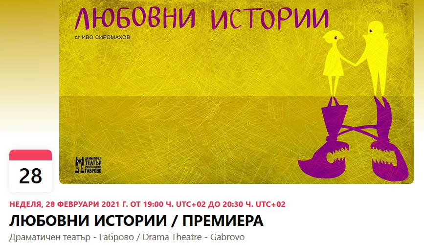 На 28 февруари т.г. в Габровския драматичен театър предстои премиера на пиесата „Любовни истории“ от Иво Сиромахов, под режисурата на Златомир Молдовански. Спектакълът е реализиран в партньорство с „Rose Valley Theatre Group“ – Чикаго.