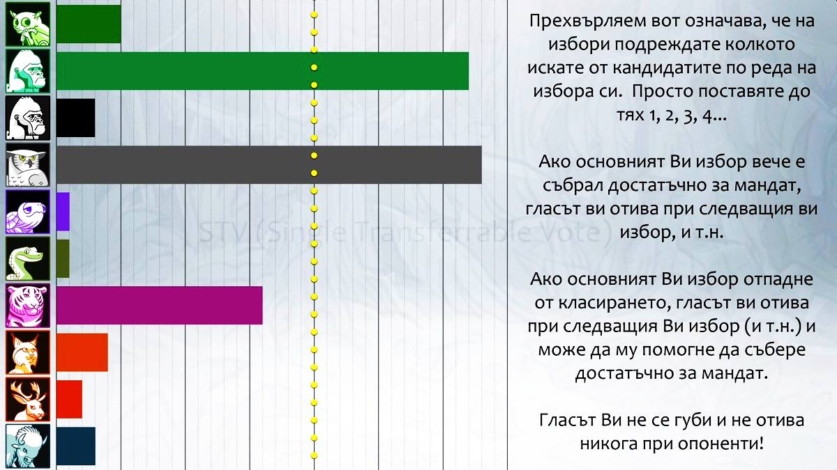 Основно – надграждане на пропорционалната система с „един прехвърляем глас“ (STV, Single Transferable Vote). В STV всеки може да избере къде да отиде гласът му, ако кандидатът, за когото гласува, не влезе или събере достатъчно гласове, и избираме отделни хора, а не партийни списъци.