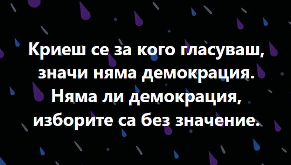 Т.е., тези достойни наши съграждани, пръснати по света, но обединени в името на справедливостта, са поискали отмяна на изборите поради тяхната нелигитимност. Като главни причини те са изтъкнали, че при гласуване зад граница (затруднено от големите разстояния между избирателните секции) няма как да бъде отчетен преференциалният вот и разпределението на подадените гласове по избирателни райони. Зад граница не може да се гласува за независими кандидати, което ги поставя и тях, и гражданите в неравностойно, ощетено положение. И понеже така съществуващият закон, както се вижда, е в изгода на партиите, то всички мълчат за този конституционен проблем. И всяко участие в избори при сегашното положение ни прави крепители на статуквото. Ерик Артър Блеър (авторът на „1984“ с псевдоним Джордж Оруел) го е казал най-добре: „Който избира корумпирани, самозванци, крадци и предатели не е жертва. Съучастник е„.