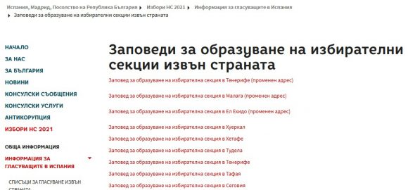 На територията на Кралство Испания са образувани 53 избирателни секции за предстоящите 4 април т.г. български парламентарни избори. Секциите са разположени в областите с най-многобройна българска общност. Тяхното местоположение и адреси могат да бъдат видени тук: https://mfa.bg/embassies/spain/ns2021/3760