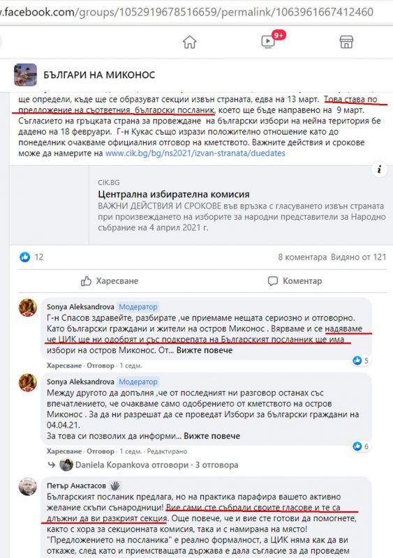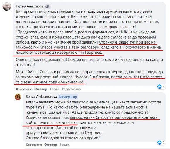 (Забележка: Ченгетата от бившата Държавна сигурност, останали нелустрирани в МВнР, продължават да всяват раздори и заблуждават българските граждани по света, и преди тези избори. На снимките по-долу ще намерите коментари на разкрития бивш сътрудник на ДС Пантелей Мирчев Спасов, щатен вербовчик в РУ на ГЩ преди 1989 г., с ранг и заплата на посланик от 2007 г. Коментарите са от закритата българска ФБ група на малкия гръцки остров Миконос. Какво той слухти там, е друг въпрос, но е факт, че създава интриги сред 200 наши съграждани на острова. За подобни интриги от служители на дипломатическите ни представителства може да научите и в други групи на доброволци за изборите, тъй като екс-ДС ченгета от Външно министерство са в над 25 държави, а техните ученици са навсякъде по света (линк).