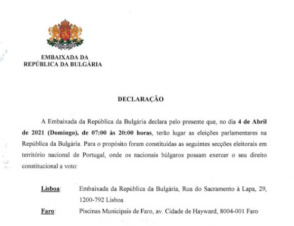 Във връзка с предстоящите на 4 април 2021 г. избори за народни представители и предвид действащите ограничителни мерки на територията на Португалия, включително забраната за придвижване между общините в периода 26 март – 5 април, посолството ни в Лисабон предоставя декларация на португалски език, която има за цел да осигури свободното придвижване до избирателните секции на българските граждани.