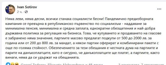 Няма леви, няма десни, всички станаха социалисти бесни! Пандемично предизборната кампания се превърна в републиканско първенство по социализъм – наддаване за минимална пенсия, минимална и средна заплата, еднократни обезщетения и най-добра държавна политика за регулация на бизнеса. Това, че купуването и продаването на гласове е забранено, няма значение, партиите масово предлагат подкупи от 500 до 2000 лв. за година или от 200 до 800 лв. за мандат, а някои партии оферират и комбинирани пакети с още по-голяма стойност. Обезпечението за тези обещания е честната дума на партиите и парите на данъкоплатците, като е сигурно, че данъкоплатците ще платят, а партиите, както винаги, няма да си удържат на обещанията.
