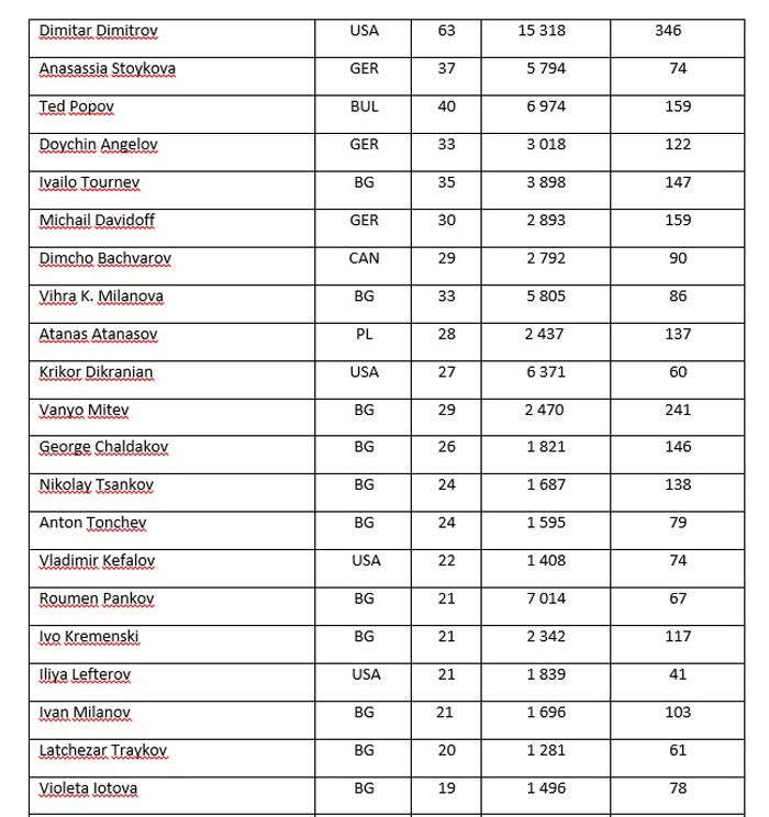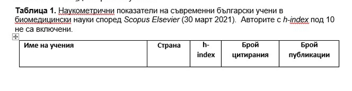 Наукометрични показатели на съвременни български учени в биомедицински науки, според Scopus Elsevier (30 март 2021). Авторите с h-index под 10 не са включени.