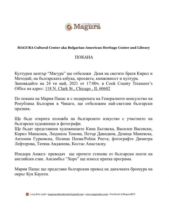Културен център„Магура“ в Чикаго ще отбележи на 24 май, от 17 часа, Деня на българската писменост, просвета и култура. Ще бъде открита изложба с участието на български художници и фотографи – художниците Кина Бъговска, Василев Васевски, Кирил Манасиев, Людмила Томова, Петър Давидков, Деница Маневска, Антония Гуркова, Полина Пеева и фотографите Димитра Лефтерова, Татяна Авджиева, Костас Анастасиу.