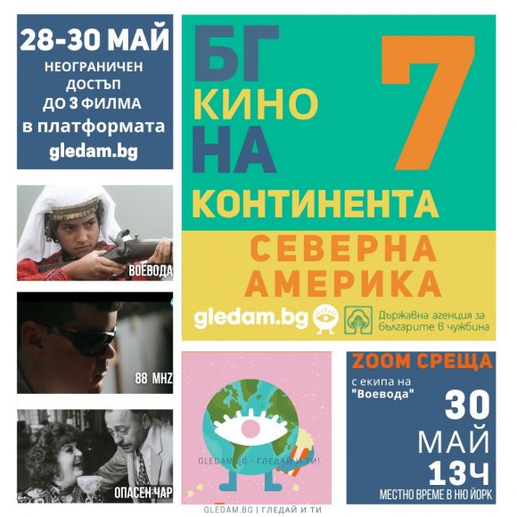 Тази седмица, от 28 до 30 май, турнето акостира на Северноамериканския бряг с 3 прекрасни български филма – “Воевода” – притча за българския дух, “88 MHZ” – документален портрет на радиоводещия Йордан Георгиев, който е незрящ, но “вижда” театъра и киното със всяко друго сетиво, и вечната класика “Опасен чар”. Всички български общности в Северна Америка имат възможнос да гледат неограничено трите филма, да съберат впечатления и да участват в организираната среща.