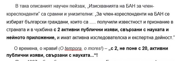 В така описаният научен пейзаж, „Изискванията на БАН за член-кореспонденти“ са срамни и унизителни: „За член-кореспонденти на БАН се избират български граждани, които са … получили известност и признание в страната и в чужбина с 2 активни публични изяви, свързани с науката и нейното приложение, и имат активна изследователска и експертна дейност.“