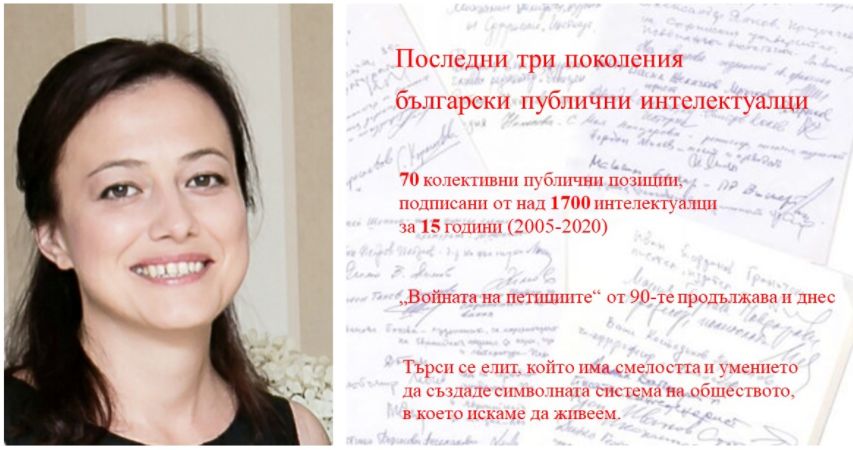 Потърсих отговорите чрез съдържателен анализ на 70 публични колективни позиции на интелектуалци от 2005-2020, публикувани в интернет медиите. Ивайло Знеполски говори за свръхпроизводство на подписки след 1989, които не представляват интелектуална реч, а радикален политически дискурс, настойчиво предупреждаващ за вината, която поемаш, ако не го последваш. „Войната на петициите“ от 90-те бавно „(само)обезличава интелектуалците“.