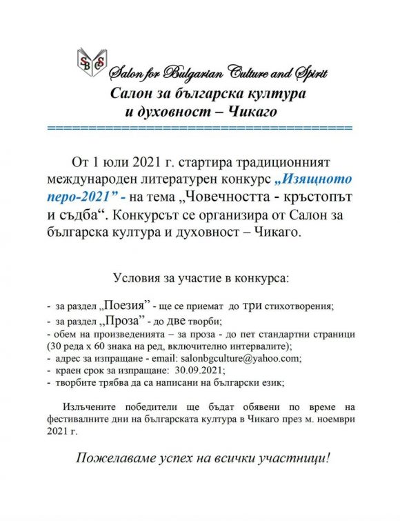 От 1 юли т.г. започна традиционният литературен конкурс „ИЗЯЩНОТО ПЕРО“, организиран от Салона за българска култура и духовност в Чикаго, съобщи председателят на Салона Снежана Галчева. Това е трето издание на конкурса, в който участват български автори от различни страни, след проведените първо и второ издания през 2017 г. и 2019 г.