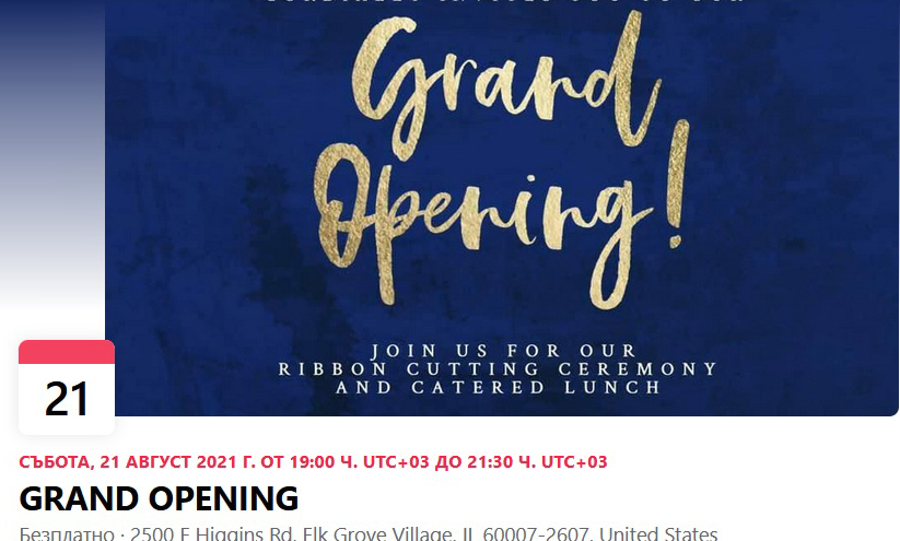 Голямото откриване е в събота, 21 август, на адрес: 2500 E Higgins Rd, Elk Grove Village, IL 60007-2607.