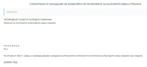 На 25 август 2021 г. се проведе първото заседание на Комисията по политиките за българите извън страната (както бе назована тази парламентарна комисия, наричаща се преди Комисия по политиките за българите в чужбина) към 46-ото Народно събрание на Р България. Дневният ред на заседанието бе: