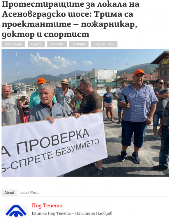 Преди да подадем настоящият сигнал, направихме всичко възможно да осъществим диалог с кмета на община Асеновград – възложител по ПУП-а за локала и прехвърлил право на строеж на АПИ, Директора на АПИ и Директора на ОПУ, за да решим въпроса на местно ниво без усложнения, сигнали, шум и проверки. След като никой не уважи исканията ни, на 05.08.2021 г. проведохме Мирен Граждански Протест, спряхме движението по републиканския път на изхода на Асеновград, като поканихме институциите и медиите да обсъдим проблема на място. Не дойдоха и не ни чуват нито кметът, нито директорите на АПИ и ОПУ, нито медиите – БНТ, БТВ и Нова ТВ, над които, изглежда, има чадър от страна на „главните проектанти на обекта”.
