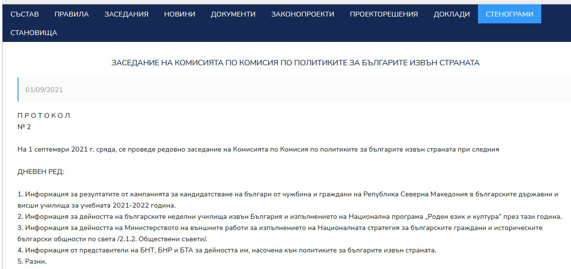 На 1 септември 2021 г. сряда, се проведе редовно заседание на Комисията по Комисия по политиките за българите извън страната при следния