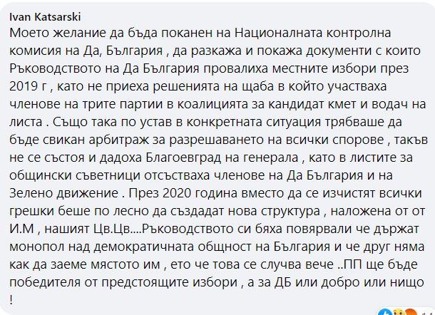 Днес ще се обърна към Националната контролна комисия на „Да, България“ с искане да бъда проверен аз и моята дейност на поста председател на партията за всички обвинения, които се отправят по мой адрес. НКК ще може да събере и систематизира всички твърдения заедно със съответните доказателства и ще може да ги представи под формата на доклад на предстоящата до края на 2021 г. Национална конференция, така че всичко да може да бъде обсъдено по структуриран и институционален начин. Всички, които имат с какво да допълнят тази картина, могат да се обръщат към НКК. Надявам се, че е излишно да подчертавам важността на тази кампания и на това всички да опитаме да не я проваляме отвътре.