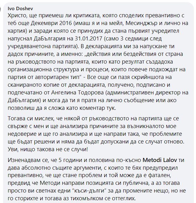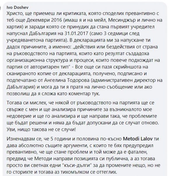 Според Лалов, оставки „следва да подадат и немалка част от Изпълнителния съвет на „Да, България“, в частност Ивайло Мирчев и Антоанета Цонева. „Недемократичното ръководство на партията демотивира и отблъсква все повече хора и привлича все повече други с клиентелистко мислене и цели“, пише Лалов във Фейсбук и продължава: „Неминуемо това ще има негативни последици за демократичната общност, които ще проличат още в резултатите от предстоящите избори“.