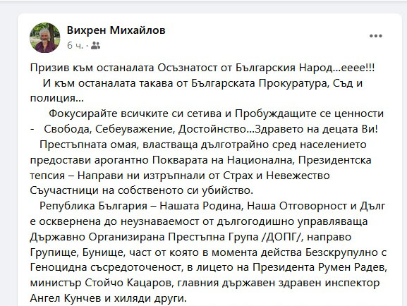 Република България – Нашата Родина, Наша Отговорност и Дълг – е осквернена до неузнаваемост от дългогодишно управляваща Държавно Организирана Престъпна Група /ДОПГ/, направо Групище, Бунище, част от която в момента действа Безскрупулно с Геноцидна съсредоточеност, в лицето на Президента Румен Радев, министър Стойчо Кацаров, главния държавен здравен инспектор Ангел Кунчев и хиляди други.“