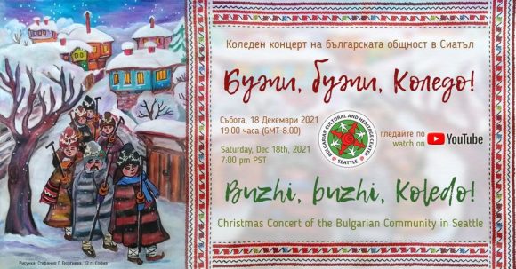 Българският културен център в Сиатъл/ Bulgarian Cultural and Heritage Center of Seattle организира на 18 декември, от 19:00 ч. (GMT-8) „БУЖИ, БУЖИ, КОЛЕДО!“ – коледен концерт на българската общност в Сиатъл. Концертът ще може да бъде видян онлайн по You Tube канала на Българския културен център в Сиатъл, който ще оповести линк към него в навечерието на събитието.