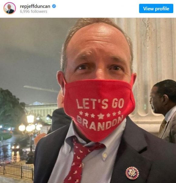 Сенаторът от Тексас Тед Круз каза, че това е „едно от най-смешните неща, които съм виждал“. Представителят на Флорида Бил Поузи завърши речта си в залата на Конгреса в края на миналия месец с тази фраза. А републиканският представител от Южна Каролина Джеф Дънкан също носеше маска, украсена с нея. На 4 ноември 2021 г. Лорън Бьбърт (кв Конгреса от Републиканската партия) носеше червена рокля с бял надпис минаващ по гърба на роклята, при срещата си с бившия президент Доналд Тръмп. Роклята имаше прилики с роклята „Tax the Rich“, носена от конгресменката Александрия Окасио-Кортез на нейното представяне в Met Gala през септември. Боубърт написа към снимката си в Туитър: „Това не е фраза, това е движение! #LGB“.