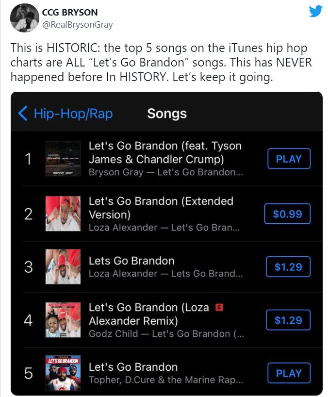 Само за няколко дни се появиха четири рап песни със същото име Let’s Go Brandon, в които авторите критикуват политиката на Байдън. Те достигнаха върха на музикалните класации и станаха водещи сред най-популярни песни в iTunes в САЩ. Вече има и танц „Let’s Go Brandon“.