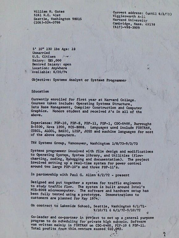 В резюмето си Бил пише, че… е висок 178 см и тежи 59 кг. Но и, че получава годишна заплата от 15 хиляди долара (към днешна дата това е поне пет пъти повече – около 75,000). А също, че е основал компания, създал код за правителствени агенции и сам се е научил на множество езици за програмиране. Както по-късно казва Гейтс: „Самообразованието е страхотно, защото после развиваш голямо самочувствие“.