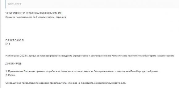 1. Приемане на Вътрешни правила за работа на Комисията по политиките за българите извън страната към 47-то Народно събрание.