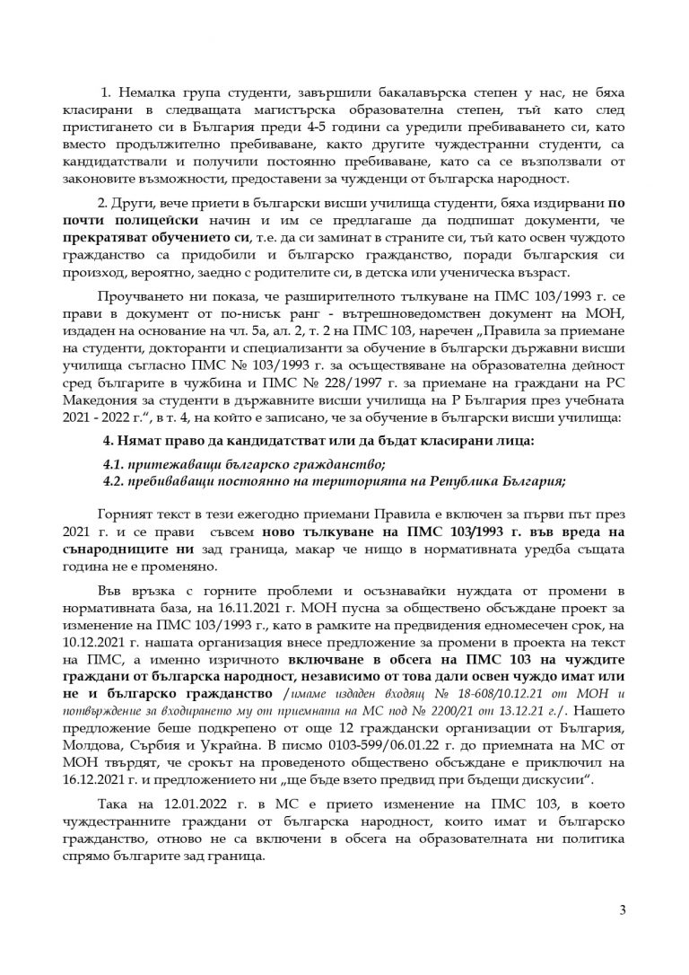 Противоречието между Закона за българите в чужбина, чиято дефиниция за българи в чужбина са лица, които, освен български произход и българско национално самосъзнание, „трайно или постоянно пребивават на територията на друга държава”, и дискриминиращото тълкуване на чл. 1. (1) от 103 ПМС, за притежателите на българско гражданство и лична карта за постоянно пребиваване, не само лишава голяма част от младите българи в чужбина да продължат образованието си в България, но и застрашава политиката за съхраняване на българското етнокултурното пространство зад граница, както и завръщането, образованието и интеграцията на млади българи от чужбина в България.
