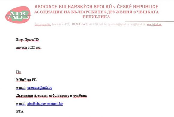 Асоциацията на българските сдружения в Чешката република е изпратила писмо до Министерството на външните работи на Р България, Държавната агенция за българите в чужбина и Българската телеграфна агенция. Писмото е свързано с делото за Българския дом в Прага.