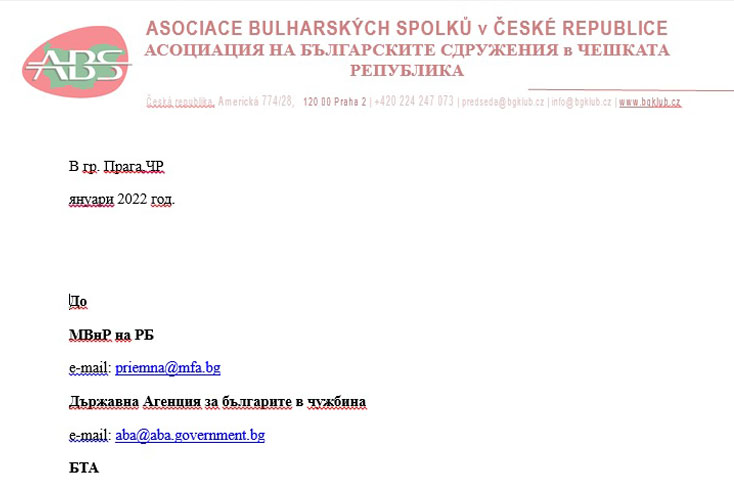 Следва целият текст на писмото на АБС в Чехия до МВнР, ДАБЧ и БТА. (Писмото в оригинал тук – АБС)