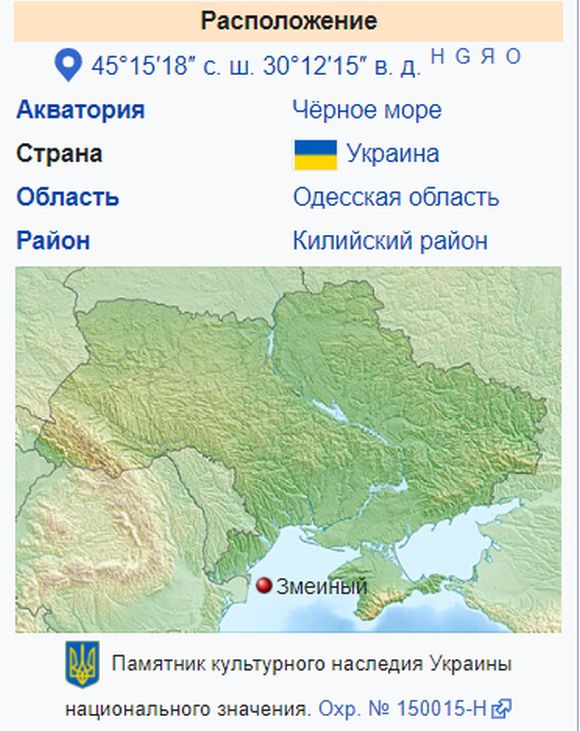Ето какво четем в Уикипедия за остров Змийски (на украински: Острів Зміїний; на старогръцки: Λευκός– Бял) е остров в Черно море, намиращ се в Одеска област, близо до делтата на река Дунав, на около 12 морски мили от украинския и румънския бряг.