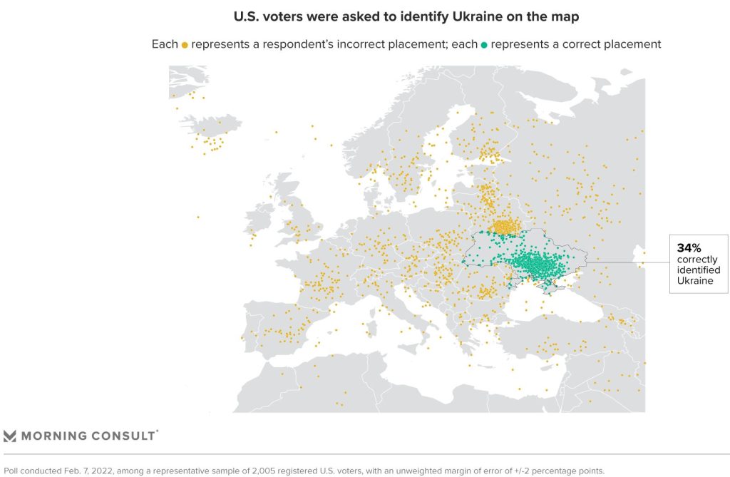 Само една трета от жителите на САЩ (34%) са успели да покажат местоположението на Украйна на картата на Европа, показа проучване на Morning Consult.