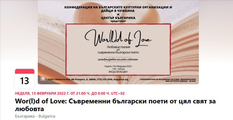 Конфедерацията на българските културни организации и дейци в чужбина (BCOAA) и Център „Българика“ – Чикаго организират първи по рода си онлайн рецитал на съвременни български поети от разни краища на света. Събитието, в което ще участват със свои творби автори от САЩ, Великобритания, Испания, Кипър, Германия, Австрия, Швеция, Израел и България, ще се състои на 13 февруари 2022 г., неделя, от 1.00 pm до 3.00 pm (21.00 – 0.00 ч. UTC+2).