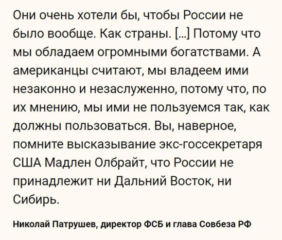 „Они очень хотели бы, чтобы России не было вообще. Как страны. […] Потому что мы обладаем огромными богатствами. А американцы считают, мы владеем ими незаконно и незаслуженно, потому что, по их мнению, мы ими не пользуемся так, как должны пользоваться. Вы, наверное, помните высказывание экс-госсекретаря США Мадлен Олбрайт, что России не принадлежит ни Дальний Восток, ни Сибирь.“
