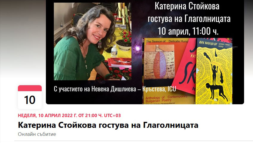 Днес, от 11 часа местно време (21:00 часа UTC+03), поетесата, издател, преводач, артист Катерина Стойкова ще гостува на Общество за поезия и литературна проза „Глаголницата“ при Българския културен център в Сиатъл. Събитието ще e с участието на Невена Дишлиева-Кръстева, издател.