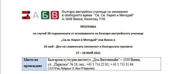 Българо-австрийското училище „Св. св. Кирил и Методий“ – Виена организира, във връзка с 30 години от своето основаване и Деня на българската просвета и култура, кръгла маса на тема „Българските училища в чужбина – минало, настояще, бъдеще“, която ще се проведе на 27 май, с участието на представители на Министерство на образованието и науката, СУ „Св. Климент Охридски“, ПУ „Паисий Хилендарски“, български неделни училища зад граница и други гости. А на 28 май – празнична културна програма, с участието на ученици от училището.