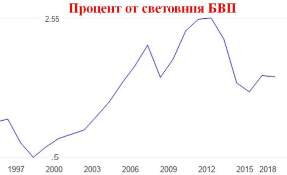 Развитието на Русия се вижда добре и като процент от световната икономика. Личи как до 2008 година брутният продукт само е растял до 2% от световния, а след това се колебае. Несъмнено след 2022 г. ще падне още надолу.