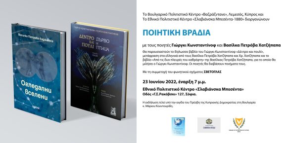 На 23 юни т.г., от 19 часа местно време, в читалище „Славянска беседа“ в София, ще се състои двойна премиера – на книгата „ОГЛЕДАЛНИ ВСЕЛЕНИ“, на нашата сънародничка в Кипър Василка Петрова Хаджипапа, и на двуезичната книга „ДЪРВО И ПТИЦА“ на Георги Константинов.