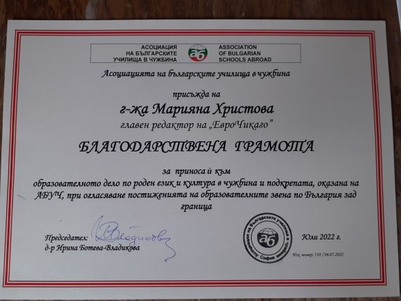 Сред наградените с благодарствена грамота на АБУЧ бе и редакторът на нашето издание Мариана Христова.