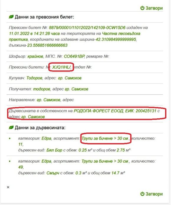 Отделно лицензираният на фирмата е известен като един от най-големите схемаджии при издаването на превозни билети с таблет 8879! Ето Ви един фалшив билет на „Родопа Ф.“ от таблет 8879, с който е открадната 17.45 м3 трупи от бор и смърч, като във фалшивия билет като произход на дървесината е написан произволен билет на друга фирма („Мальовица Лес“ ЕООД) за 15.24 м3 съвсем различни трупи от само бор с други размери…. И така са откраднати още хиляди кубици под носа на държавата (тук се пробвахме с един софтуерен хак да спрем таи схема в ИАГ – дано вече работи!).