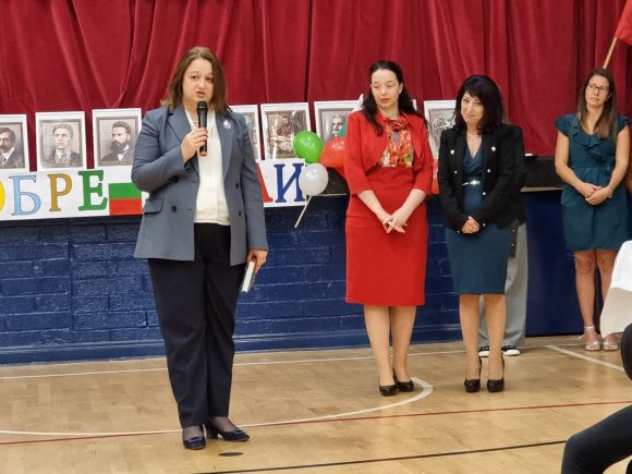 За нас е чест да виждаме сред нас Посланика на Република България в Ирландия – г-жа Гергана Караджова, която заяви подкрепата на дипломатическото представителство, изрази признателност за всеотдайната и родолюбива дейност на училищния екип и пожела на добър час по пътя на знанието.