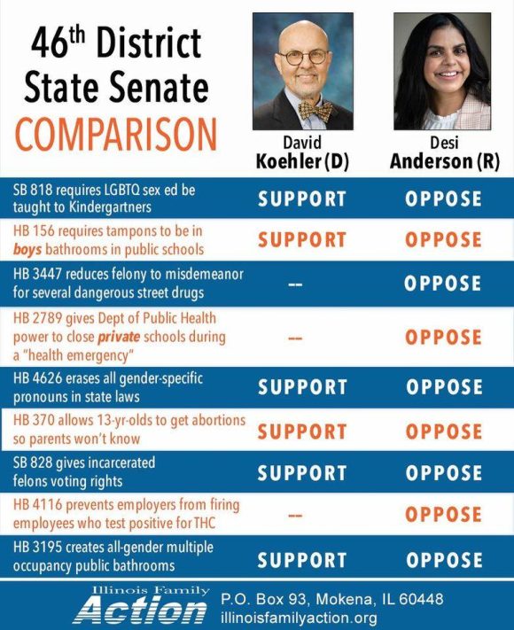 „В момента 46-ти окръг и централен Илинойс не са в по-добро положение, отколкото, когато моят опонент сенатор Дейв Кьолер влезе в политиката преди повече от 40 години. Какво е направил той, за да подобри живота на своите избиратели оттогава? Престъпността е извън контрол, семействата не могат да си позволят продукти от първа необходимост, бизнесът напуска Илинойс, приема се опасно законодателство и депутатите от Демократическата партия обръщат гръб на нашите правоприлагащи органи…. Залозите на тези избори не биха могли да бъдат по-високи, тъй като сенатор Кьолер се стреми да изкара още един мандат, докато слуша какво иска град Чикаго, вместо собствените си избиратели и съседи тук, в 46-и район. Аз съм собственик на малък бизнес и майка с различен глас, която е готова да донесе положителна промяна в нашите общности. Тук, в 46-ти район, е време за промяни и аз имам опита и мотивацията да осъществя тези промени.“