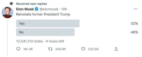 Туитът на Мъск дойде 24 часа, след като той публикува анкета, в която пита потребителите на Twitter дали Тръмп, който беше изгонен от платформата от предишната собственост след бунта на Капитолийския хълм на 6 януари 2021 г., трябва да бъде допуснат обратно в платформата.